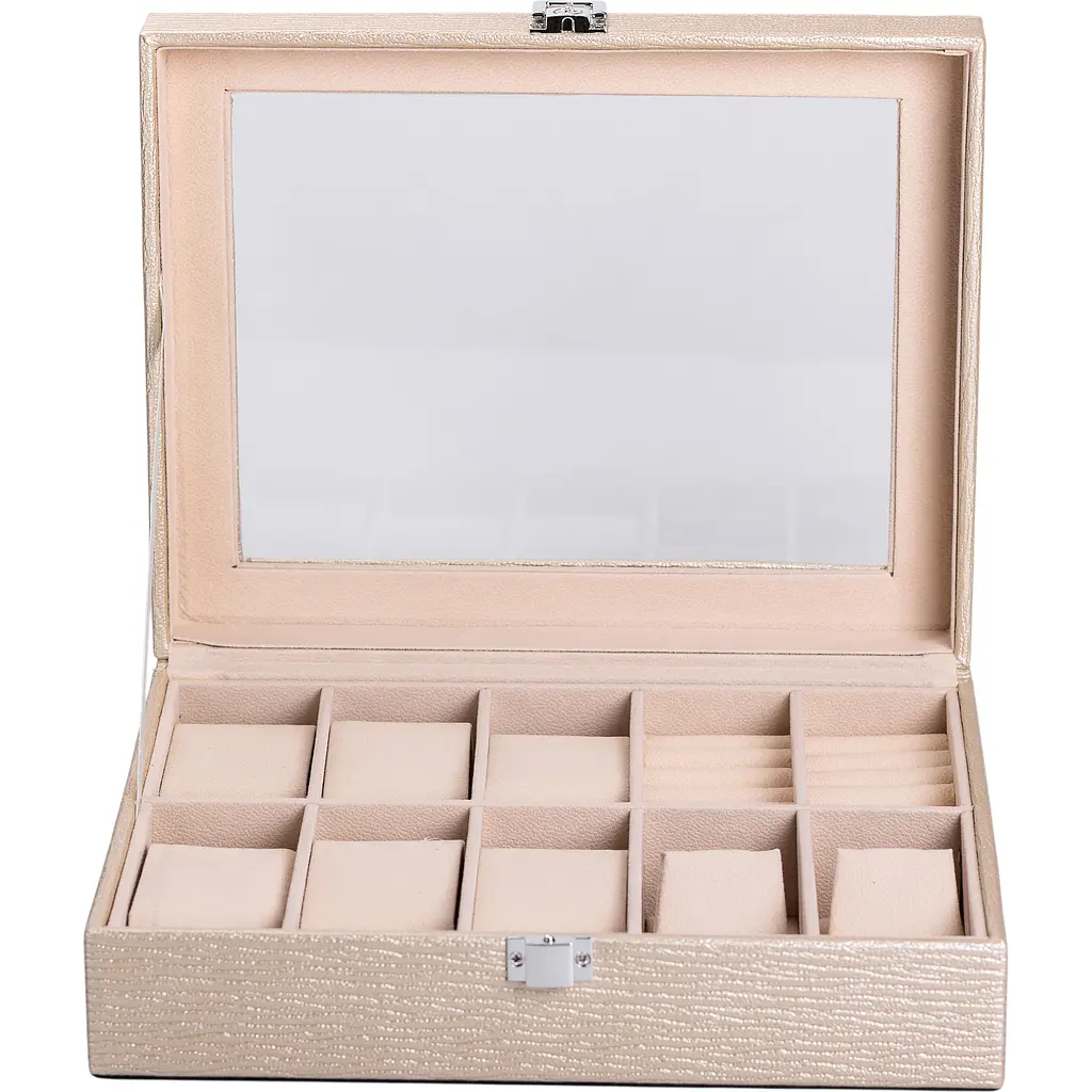 Скринька-органайзер Yiwu для прикрас та аксесуарів розміром 25.5x20x7.5 см - практичне рішення для зберігання наручних годинників, каблучок, браслетів та ланцюжків. Органайзер має 10 відсіків з велюровим оздобленням, завдяки чому можна організувати прикраси з різних дорогоцінних металів, біжутерію, годинник у задуманому власником порядку. Внутрішнє оздоблення відмінно підходить для перлів, каменів та різних синтетичних матеріалів, які використовуються як вставки для аксесуарів.