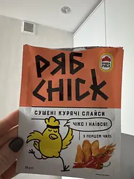 Слайси курячі РябChick з перцем чилі сушені - шматочки філе курчати-бройлера довільної форми, нарізані у вигляді слайсів товщиною до 5 мм з поперечним перерізом 1-6 см і схильні до процесу термічної обробки для видалення вологи.