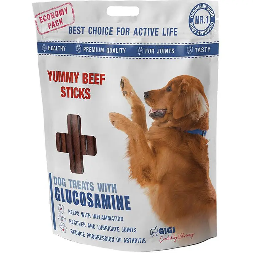 Це смачні та корисні палички з яловичини для Ваших улюбленців, збагачені глюкозаміном. Вони стануть чудовим доповненням до раціону Вашої собаки, адже мають такі корисні властивості: -Допомагають зменшити запалення -Відновлюють та змащують суглоби -Сповільнюють прогресування артритуСклад: Яловичина 80,9%, Рисове борошно 5,8%, Кукурудзяний крохмаль 4%, Рослинний білок 6,1%, Гліцерин 2,8%, Сіль 0,2%, Сорбат калію 0,1% (1k202), Глюкозамін 0,1%. Аналіз: сирий білок 14%, сирі олії та жири 5%, сира зола 7%, сира клітковина 5%, вологість 27%. Спробуйте ласощі "Yummy Beef Sticks" від GiGi — Ваш пес буде вдячний, а його суглоби стануть міцнішими та здоровішими!