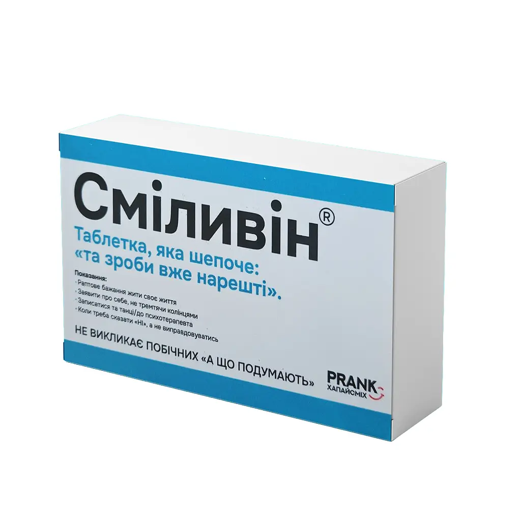 Шоколад Prank хапайсміх Сміливін 50 г (APT-116) – це солодкий «еліксир» хоробрості для тих, кому не вистачає фінального поштовху до дії. Оригінальне пакування у вигляді аптечного засобу додає впевненості через гумор, перетворюючи хвилювання на позитивну енергію. Плитка виготовлена з високоякісного шоколаду з глибоким ароматом, який дарує приємне відчуття комфорту та допомагає зосередитися на головному. Такий формат ласощів стане ідеальним символічним подарунком для кожного, хто готується до важливої події або просто потребує порції натхнення.