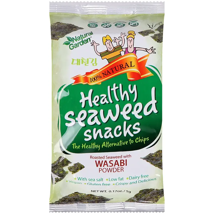 Снеки Natural Garden норі зі смаком васабі смажені - це популярний корейський продукт, який являє собою смажені листи водоростей норі, приправлені васабі. Вони мають хрустку текстуру, пікантний смак і багаті на корисні речовини.