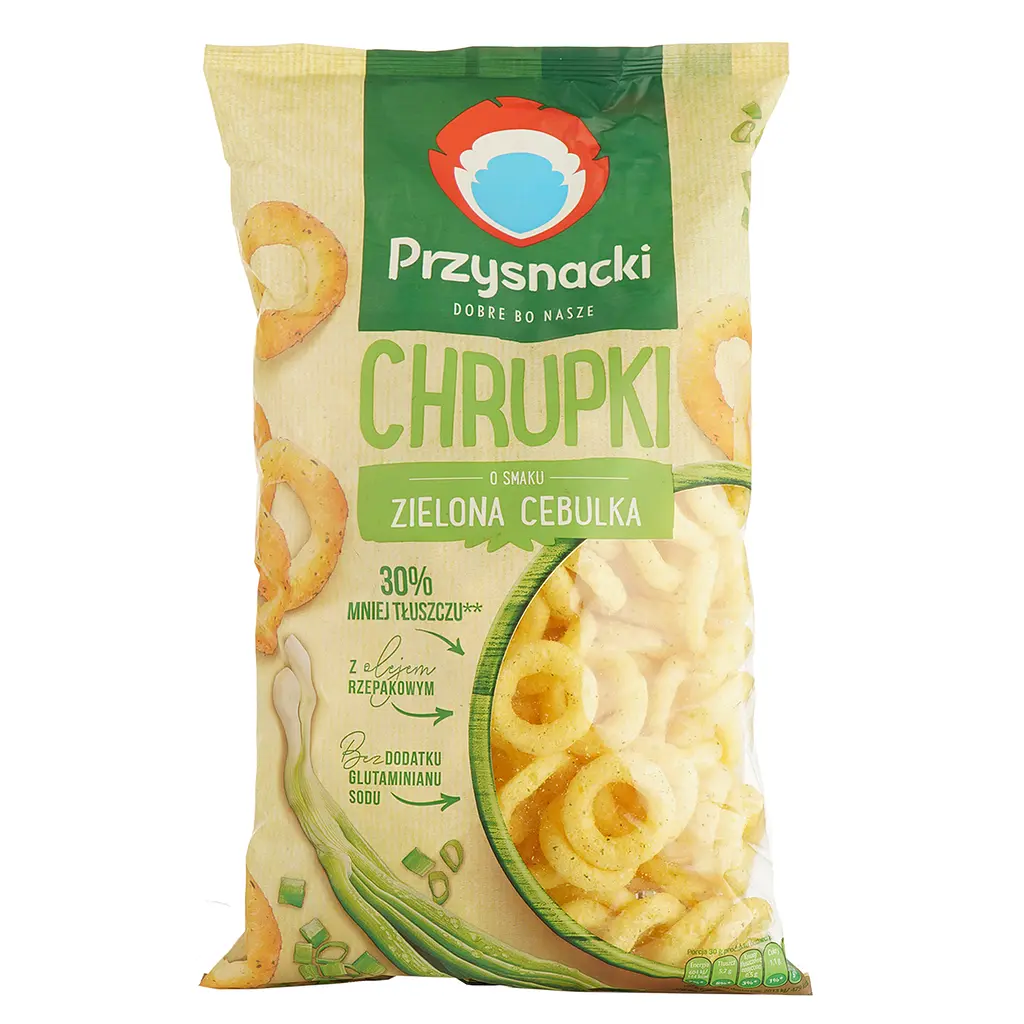 Снеки Przysnacki кукурудзяні зі смаком зеленої цибулі - це смачна та ароматна закуска, створена для тих, хто цінує свіжість та пікантність у своєму перекусі. Ці хрумкі кукурудзяні снеки приготовані з якісного кукурудзяного зерна та ароматизовані ніжним та освіжаючим смаком зеленої цибулі.
