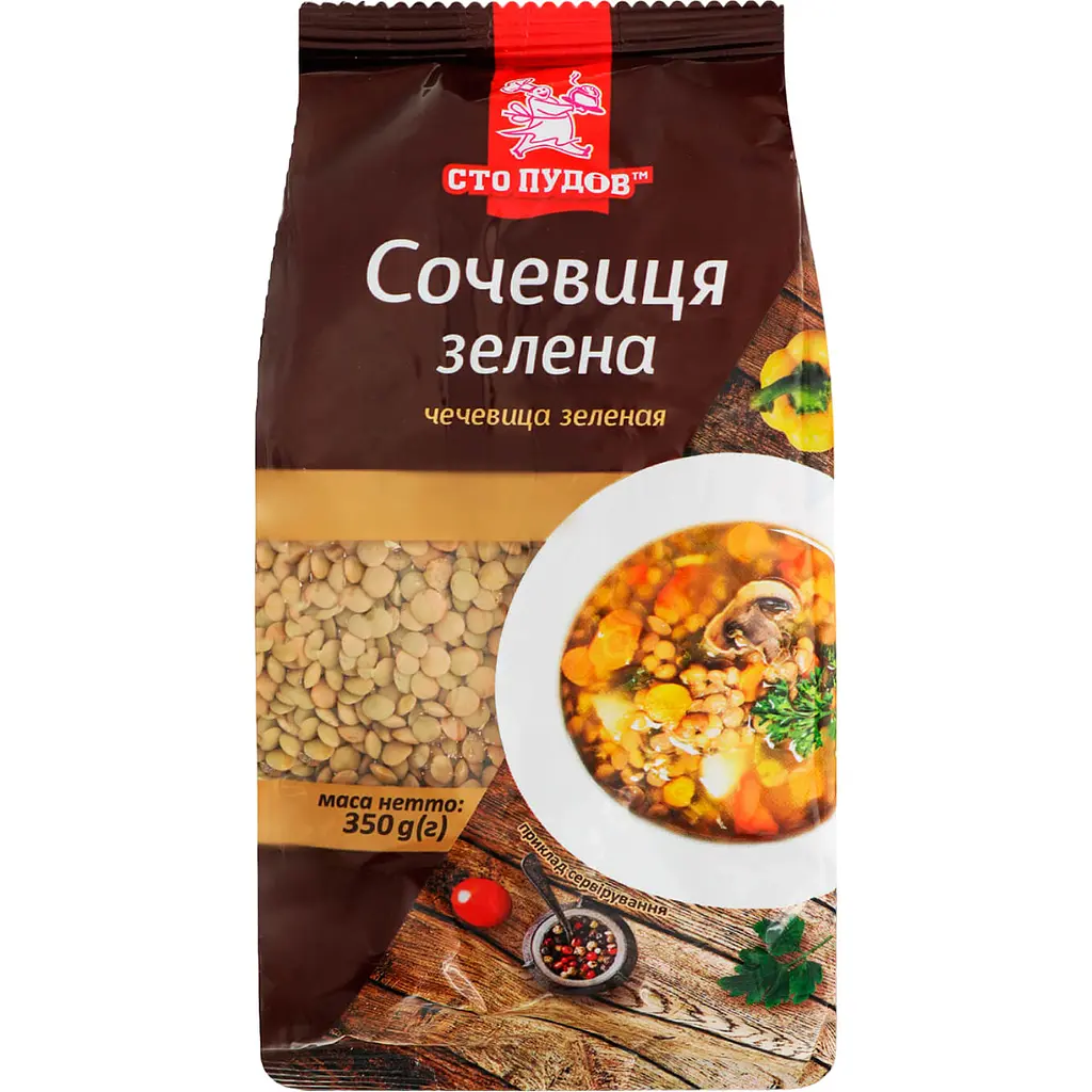 Купувала зелену сочевицю «Сто пудів» 350 г. Якість хороша — зерна чисті, без зайвого сміття. Сочевиця швидко вариться, добре тримає форму і має приємний смак. Використовувала для супу та гарніру — виходить смачно і поживно. Хороший продукт за доступну ціну.