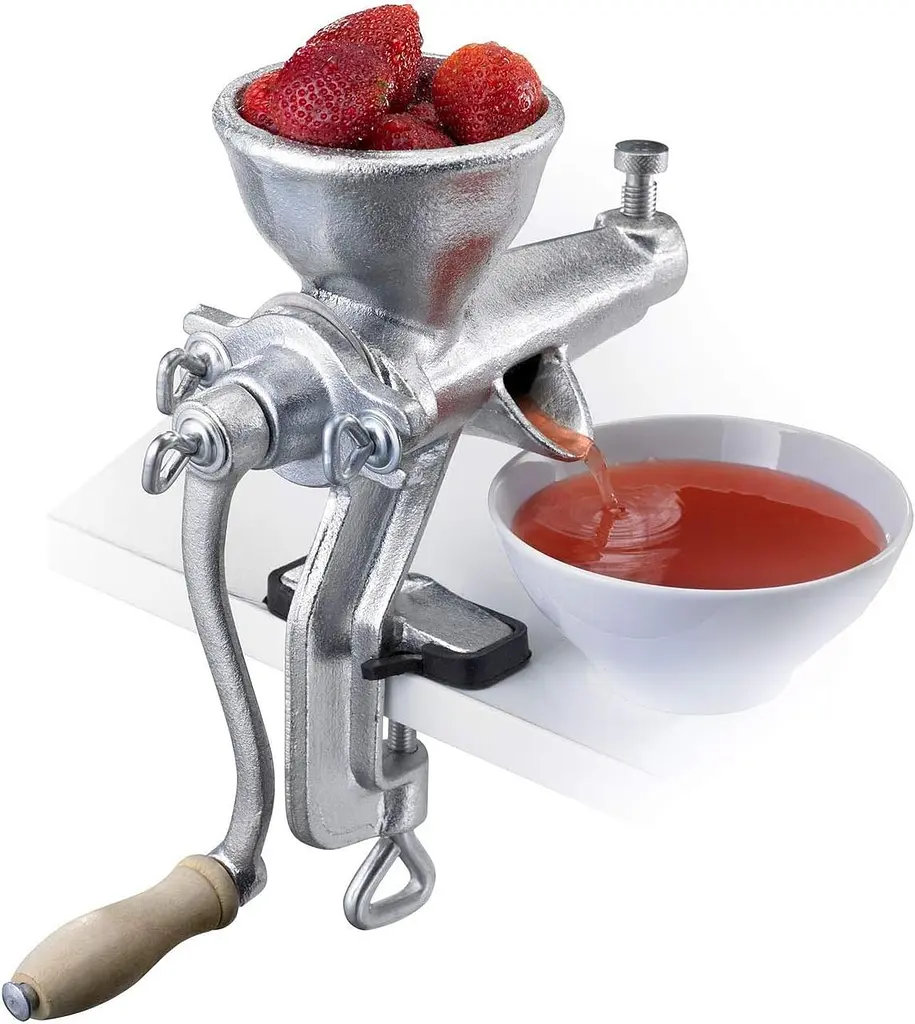 Виноград, бузина, ожина та інші ягоди легко вичавлюються в соковитискачі для соку, а насіння ягід утримується ситом і транспортується вперед разом із пресованою м’якотю. Гвинтовий затискач забезпечує міцне утримання, а гумова прокладка, що входить у комплект, запобігає подряпинам на столі. У комплект поставки входить штовхач для безпечного наповнення.