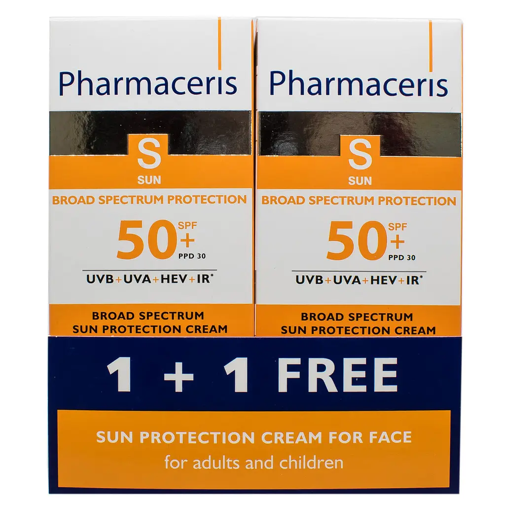 Сонцезахисний крем для обличчя Pharmaceris S Sun Protect 1+1 широкого спектру дії забезпечує захист від шкідливого впливу UVA-, UVB- та HEV-випромінювання та допомагає звернути назад пошкодження, спричинені інфрачервоним випромінюванням.