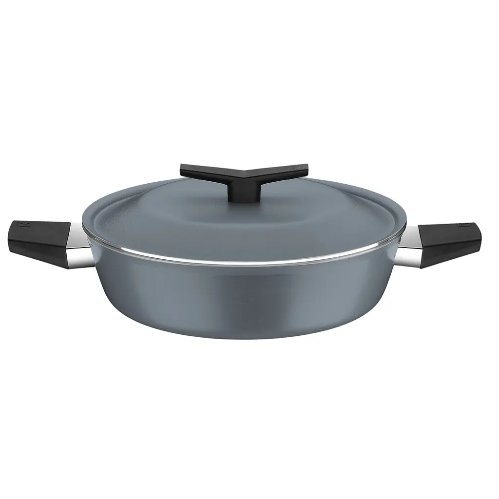 Сотейник виготовлений з алюмінію, що забезпечує рівномірний розподіл тепла, і оснащений антипригарним покриттям для легкого очищення та приготування з мінімальною кількістю олії. Він сумісний із усіма типами плит, включно з індукцією, але не рекомендується мити в посудомийній машині для збереження властивостей.