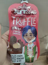 Справжній чорний трюфель коштувати не доводилось, то хоч в соусі спробувала. В складі є печериці, 0,1% сушеного трюфелю та ароматизатор “Трюфель”. Тому гарно відчувається насичений грибний смак. Використовувала як соус для піци - це дуже смачно!