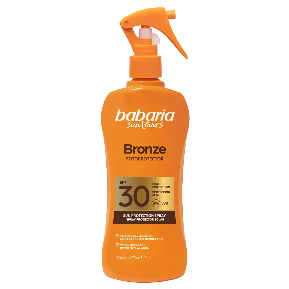 Спрей для тіла Babaria Bronze Sun Protection для засмаги з бронзуючим ефектом SPF 30 – це ідеальний базовий засіб для тих, хто мріє про красиву, рівномірну засмагу та надійний захист в одному флаконі. Зручний формат спрею об'ємом 200 мл забезпечує максимальний комфорт: його легко наносити та зручно брати з собою на пляж. Надзвичайно легка текстура миттєво поглинається епідермісом, абсолютно не залишаючи жирної плівки чи відчуття липкості на тілі. Аромат продукту максимально делікатний та свіжий, що є критично важливим для чутливої шкіри, схильної до подразнень. Цей б'юті-продукт подарує вашому тілу тривалий захист, глибоке зволоження та розкішний доглянутий вигляд.