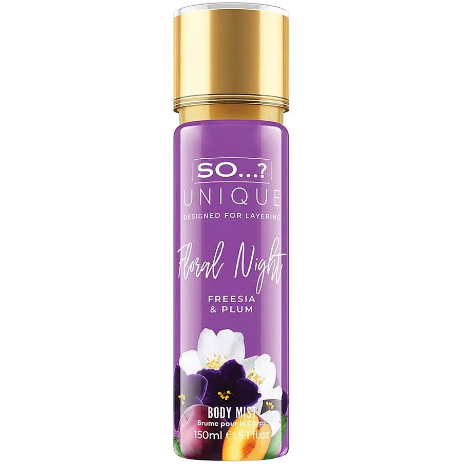 Спрей для тіла So…? Unique Floral Nights - м'який, затишний чуттєвий аромат із витонченим романтичним характером. Пориньте в магію флеру грайливої квітки фрезія та солодкої сливи, а яблуко живитиме ваше тіло. Спрей приємно освіжає та одночасно ароматизує тіло. Створи свій ексклюзивний парфум, адже всі аромати серії Unique гарно нашаровуються та комбінуються між собою!