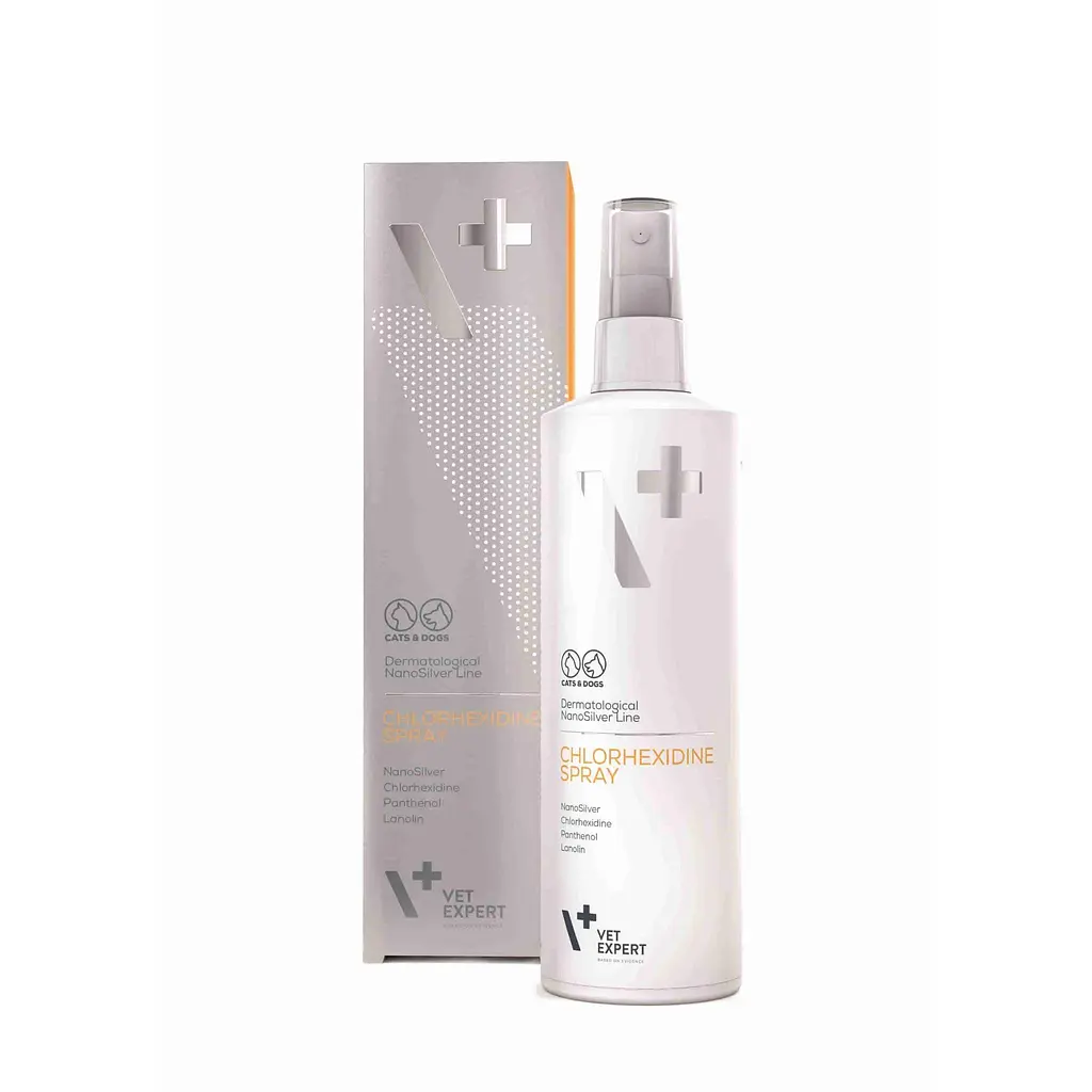 Спрей з хлоргексидином для місцевого застосування у собак і кішок з ураженнями шкіри, а також з бактеріальними інфекціями шкіри. Продукт інноваційної лінійки дерматологічної косметики з наносріблом, спрямований на вирішення проблеми шкірних уражень різного походження.