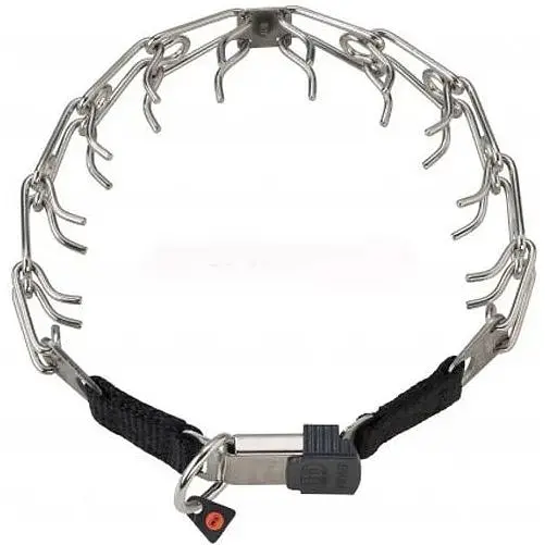 Строгий нашийник з довгими дротяними шипами призначений для дресирування та повсякденного вигулу собак. Особливістю строгих нашийників Sprenger є специфічне розташування ланок, які з'єднані не по колу, одна за одною, а розходяться в протилежні сторони від центральної пластини нашийника, створюючи "ефект щелеп", завдяки чому навантаження рівномірно розподіляється по всій довжині нашийника. Кінці зубчиків нашийника гладкі і не травмують шкіру собаки під час носіння. Підганяючи нашийник за розміром, Ви можете без труднощів зменшити або збільшити кількість ланок, відповідно підібравши додаткові ланки потрібної ширини та діаметра дроту. Нашийник оснащений унікальним замком ClicLock, який полегшує процес застібання-розстібання нашийника на собаці, і ніколи самостійно не розстібнеться в процесі експлуатації, а значить, собака не втратить нашийник на прогулянці. Шерсть у місцях контакту з нашийником не фарбується і не травмується, виріб чудово носиться за будь-якої погоди. Нашийник необхідно знімати після прогулянки або тренування. Підійде собакам із шерстю будь-якого типу, довжини та густоти. Зі строгим нашийником контролювати вихованця під час прогулянки буде легко. Дана модель нашийника представлена у двох матеріалах: нержавіюча сталь, воронена сталь.