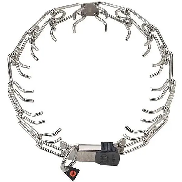 Професійний строгий нашийник (парфорс) Sprenger Ultra-Plus призначений для посилення впливу на собаку під час дресирування, коли на вихованця не вдається вплинути альтернативними методами. Рекомендується використовувати тільки професійним інструкторам і тренерам. "Строгач" являє собою ланцюг з дротяних ланок з шипами, розташованими по внутрішній стороні нашийника. Ланки з'єднані не по колу, одна за одною, а розходяться симетрично від центральної пластини нашийника. Завдяки цьому навантаження рівномірно розподіляється по всій довжині нашийника. Дана модель нашийника Sprenger УЛЬТРА-ПЛЮС відрізняється від аналогічної амуніції тим, що ланцюг з'єднується з замком безпосередньо, немає ніяких нейлонових пряжок, і додано 4 додаткових ланки. Завдяки такій жорсткій конструкції вплив на шию собаки збільшено до 90%. Дія шипів суворого нашийника Sprenger Ultra-Plus (при його правильному використанні) найбільш наближена за впливом до укусу мами-собаки, яка навчає цуценя, або старшого члена зграї, що попереджає про неправильну поведінку або утвердження авторитету. Шипи натискають на шкіру на шиї собаки, посилаючи їй сигнал у той момент, коли собака починає тягнути повідець або демонструє погану поведінку та непослух. Кінці шипів нашийника добре закруглені, тому шкіра собаки не травмується. Модель Sprenger Ultra-Plus із замком ClicLock максимально зручна в експлуатації. Замок значно спрощує одягання та зняття нашийника. Карабін повідця кріпиться за сталеве зварне кільце, розташоване на замку. Парфорс Sprenger Ultra-Plus має стандартну довжину, яка регулюється лише зняттям ланок або їх додаванням:- калібр дроту ланки 3,2 мм найбільш ефективний при дресируванні собак середніх порід (вагою до 40 кг), а також вихованців з густою шерстю, зменшує або збільшує довжину нашийника на 3 см. 6 важливих правил використання суворого нашийника для собак: 1. Строгий нашийник Sprenger Ultra-Plus не призначений для постійного носіння, а також як прогулянковий нашийник, він необхідний під час дресирування. Після дресирування строгий нашийник необхідно зняти. 2. Корекція поведінки собаки при використанні строгого нашийника здійснюється різким ривком і швидким виправленням поведінки тварини. Повідець потрібно смикати коротко і твердо, а потім послабити тиск, не можна дозволяти собаці тягнути вас постійно.3. Суворий нашийник застосовується для навчання дорослих собак. Ніколи не використовуйте парфорс для цуценят!4. На суворий нашийник не вішають жодних бирок та адресників - це амуніція, яка призначена виключно для дресирування собак.5. Запорука успішної дії "строгача" - підгонка довжини нашийника та його правильне надягання на шию собаки (див. Інструкцію).6. Суворий нашийник ніколи не можна використовувати з рулеткою. Чому варто купити строгий професійний нашийник для собак Sprenger Ultra-Plus:ефективний тренувальний нашийник для успішної щадної корекції поведінки при правильному використанні;рекомендується використовувати професійним інструкторам і тренерам;справляє 90% вплив на шию собаки за рахунок 4-х додаткових ланок і прямого з'єднання дротяного ланцюга з замком; міцний, надійний і зручний в експлуатації;швидко одягається і знімається завдяки замку ClicLock; виготовлений з нержавіючої сталі преміум-якості, стійкої до іржі та корозії, умов екстремальної вологості, морської води та поверхневих механічних пошк