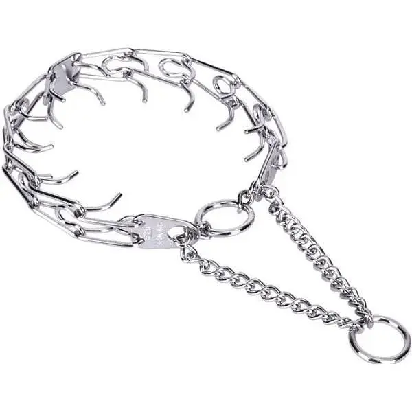 Строгий нашийник (парфорс) Sprenger Ultra-Plus призначений для посилення впливу на собаку під час дресирування, коли на вихованця не вдається вплинути альтернативними методами. Рекомендується використовувати тільки після консультації з професійним інструктором і під його наглядом."Строгач" складається зі статичної частини (ланцюг з дротяних ланок з шипами, розташованими по внутрішній стороні нашийника) та ривкового однорядного ланцюга зі зварними кільцями для пристібання карабіна повідця. Коли повідець ослаблений, вихованець не відчуває жодного впливу і не обмежений у рухах. Як тільки собака робить ривок або демонструє погану поведінку та непослух, ривковий ланцюг стягується при натягу повідця, шипи нашийника з зусиллям тиснуть на шию, що дає вихованцеві сигнал про небажану поведінку. При максимальному натягу та затягуванні довжина нашийника може зменшитися на 10 см.Ланки з шипами з'єднані не по колу, одна за одною, а розходяться симетрично від центральної пластини нашийника. Завдяки цьому навантаження рівномірно розподіляється по всій довжині. Кінці шипів нашийника добре закруглені, тому шкіра собаки не травмується. ВАЖЛИВО! Нашийник-напівдушилка для собак Sprenger Ultra-Plus не має застібки. Одягати його на собаку слід тільки роз'єднавши ланцюг, розстібаючи 1 ланку, а потім застібаючи його вже на шиї собаки. Дана модель не одягається через голову собаки - тільки через розстібання-застібання шипованої ланки ланцюга.Парфорс-напівдушилка Sprenger Ultra-Plus має стандартну довжину, яка регулюється тільки зняттям ланок або їх додаванням: - калібр дроту ланки 3,2 мм найбільш ефективний при дресируванні собак середніх і великих порід (вагою до 50 кг), зменшує або збільшує довжину нашийника на 3 см;- калібр дроту ланки 4 мм призначений для собак великих порід (вагою до 70 кг), зменшує або збільшує довжину нашийника на 3,6 см. 6 важливих правил використання суворого нашийника для собак: 1. Суворий нашийник Sprenger Ultra-Plus не призначений для постійного носіння, а також як прогулянковий нашийник, він необхідний під час дресирування. Після дресирування суворий нашийник необхідно зняти. 2. Корекція поведінки собаки при використанні суворого нашийника здійснюється різким ривком і швидким виправленням поведінки тварини. Повідець потрібно смикати коротко і твердо, а потім послабити тиск, не можна дозволяти собаці тягнути вас постійно.3. Суворий нашийник застосовується для навчання дорослих собак. Ніколи не використовуйте парфорс для цуценят!4. На суворий нашийник не вішають жодних биркок та адресників - це амуніція, яка призначена виключно для дресирування собак.5. Запорука успішної дії "строгача" - підгонка довжини нашийника та його правильне надягання на шию собаки (див. Інструкцію).6. Суворий нашийник ніколи не можна використовувати з рулеткою. Чому варто купити строгий нашийник-напівзадушливий для собак Sprenger Ultra-Plus: ефективний тренувальний нашийник для успішної корекції поведінки при правильному використанні; поєднує методи, які ефективно працюють з усіма собаками і в той же час можуть бути адаптовані до індивідуального темпераменту вашого улюбленця;міцний, надійний і зручний в експлуатації; виготовлений з нержавіючої сталі преміум-якості, стійкої до іржі та корозії, умов екстремальної вологості, морської води та поверхневих механічних пошкоджень (порізи, под
