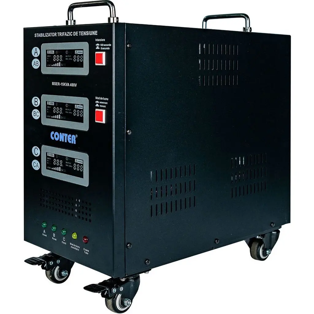 Трифазний стабілізатор напруги Conter MSER з сервоприводом потужністю 15 кВА та активною потужністю 12 кВт призначений для підтримки стабільних параметрів електроживлення у мережах 380 В. Пристрій працює у широкому діапазоні вхідної напруги від 225 до 450 В, забезпечуючи на виході стабільні 400 В з точністю стабілізації ±3%, незалежно від коливань у мережі чи зміни навантаження. Такий принцип роботи дозволяє зберігати коректне живлення навіть у нестабільних електромережах.Охолодження та індикація