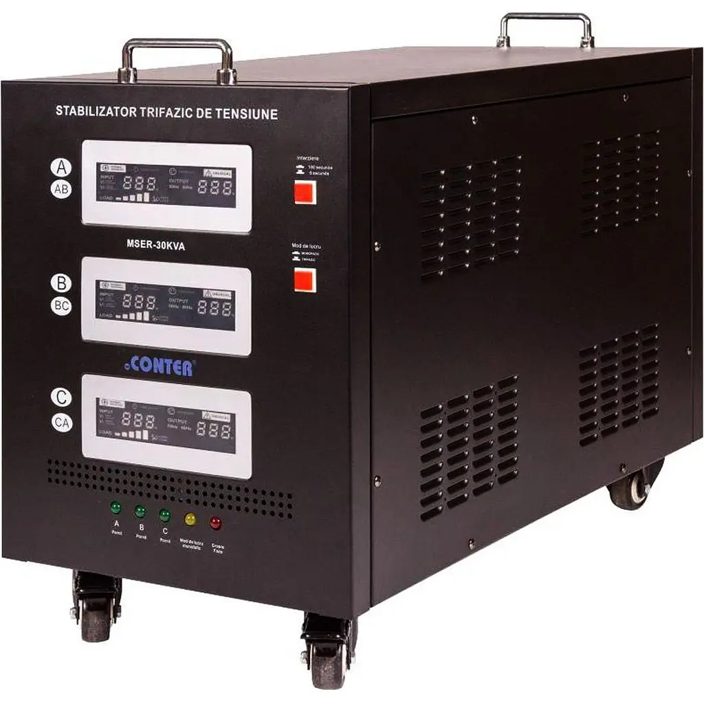 Трифазний стабілізатор напруги Conter MSER з сервоприводом потужністю 30 кВА та активною потужністю 24 кВт призначений для підтримки стабільних параметрів електроживлення у мережах 380 В. Пристрій працює у широкому діапазоні вхідної напруги від 225 до 450 В, забезпечуючи на виході стабільні 400 В з точністю стабілізації ±3%, незалежно від коливань у мережі чи зміни навантаження. Такий принцип роботи дозволяє зберігати коректне живлення навіть у нестабільних електромережах.Охолодження та індикація