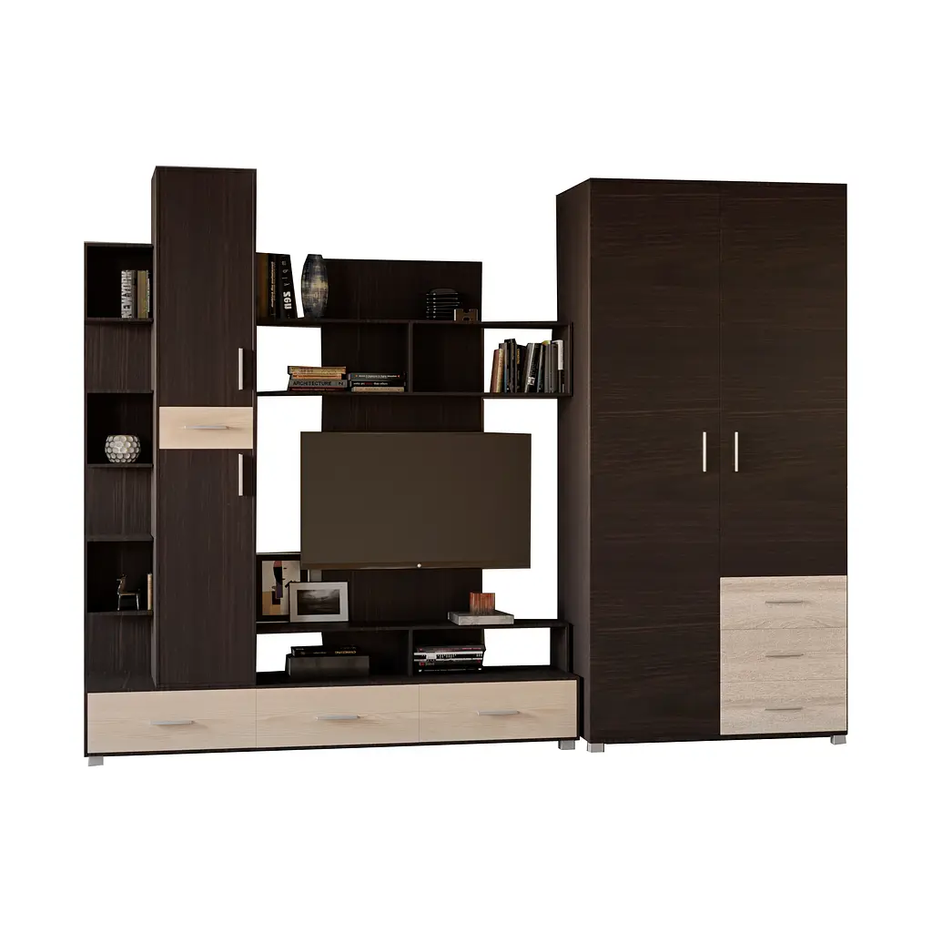 Практична та надійна конструкція складається зі стінки для вітальні та великої розпашної шафи з трьома висувними ящиками. Також стінка укомплектована ТВ-полицею для телевізора. Дана модель - це максимально практичні меблі для облаштування сучасної вітальні.