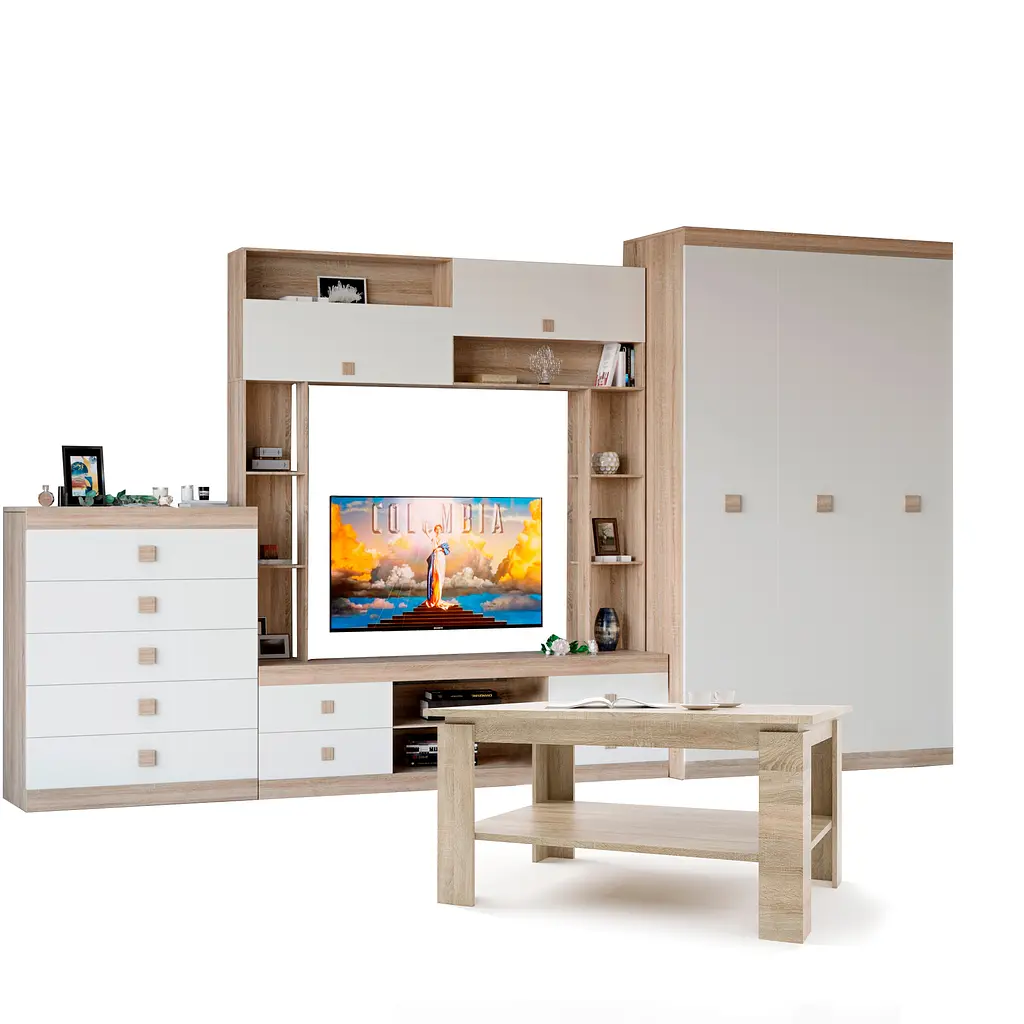 Функціональна конструкція складається з чотирьох окремих елементів, що дозволяє встановити меблі у необхідному порядку. Велика шафа для зручного зберігання одягу. Високий комод укомплектована п'ятьма висувними ящиками. Меблевий гарнітур доповнюють стінка з нішою для тв та журнальний стіл.