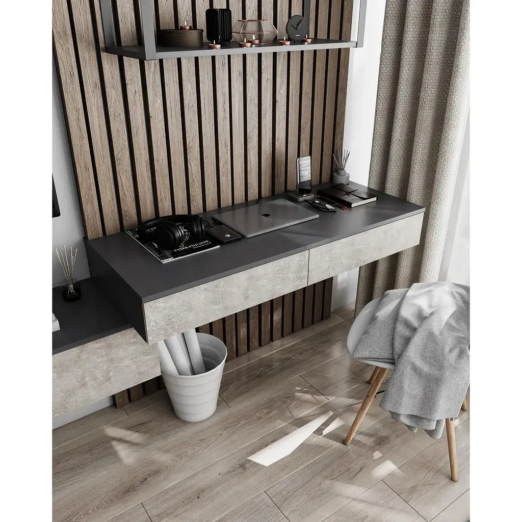 Підвісний письмовий стіл Moreli T-222 Підвісний стіл Moreli T-222 - практичний та доступний за ціною варіант для роботи чи навчання. Письмовий стіл вигідно відрізняє простора робоча поверхня. Дві висувні шухляди, допоможуть зручно розмістити в зоні швидкого доступу канцелярське приладдя, навчальні матеріали та особисті речі. Розміри Ш1200 мм/ 160 мм/ Г500 мм Базові декори 8 шт корпус та фасад можуть бути комбіновані між собою