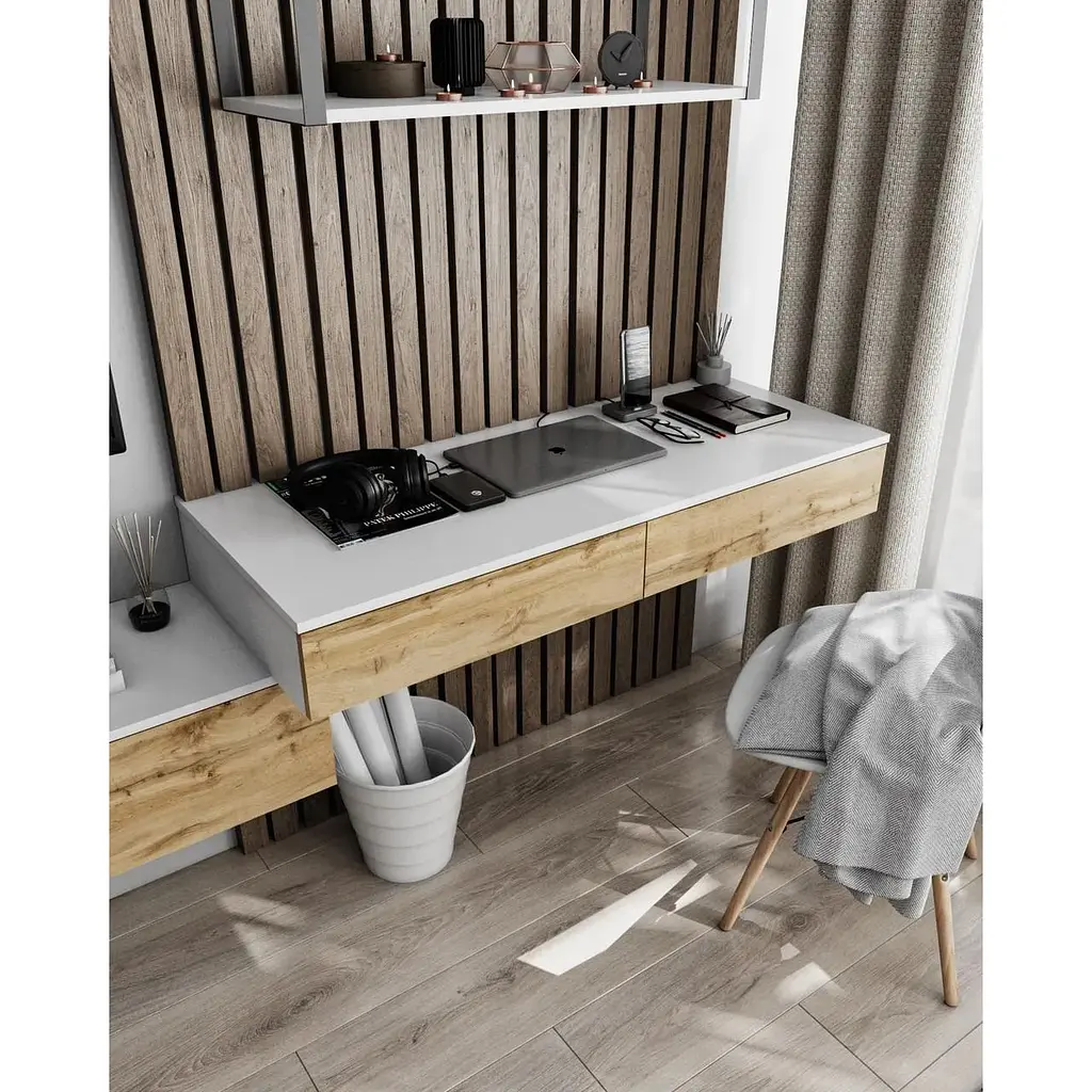 Підвісний письмовий стіл Moreli T-222 Підвісний стіл Moreli T-222 - практичний та доступний за ціною варіант для роботи чи навчання. Письмовий стіл вигідно відрізняє простора робоча поверхня. Дві висувні шухляди, допоможуть зручно розмістити в зоні швидкого доступу канцелярське приладдя, навчальні матеріали та особисті речі. Розміри Ш1200 мм/ 160 мм/ Г500 мм Базові декори 8 шт корпус та фасад можуть бути комбіновані між собою