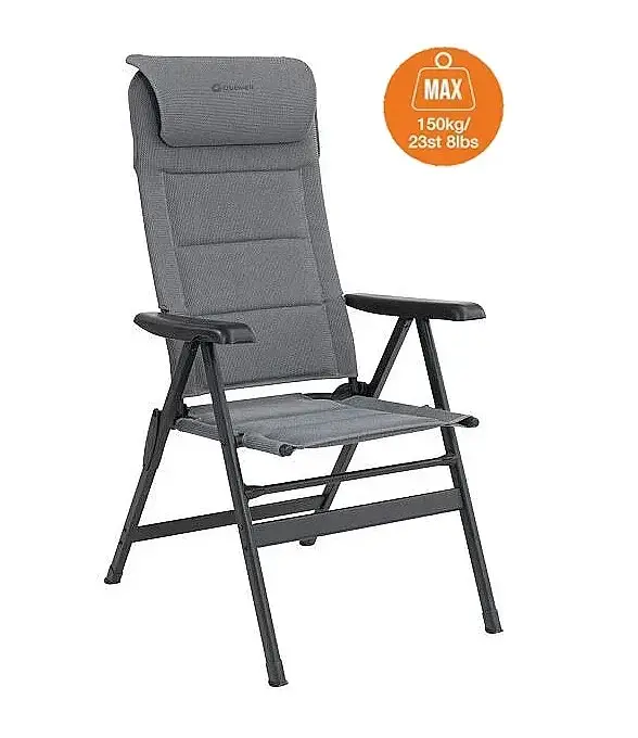 Стілець кемпінговий Outwell Teton поєднує швидковисихаючу підкладку з сітчастою тканиною Textiline стильного чорного кольору. Крісло має регульований, знімний підголівник і водовідштовхувальний матеріал під тканиною, щоб запобігти вбиранню води в пінопластову підкладку, якщо її залишити під дощем.