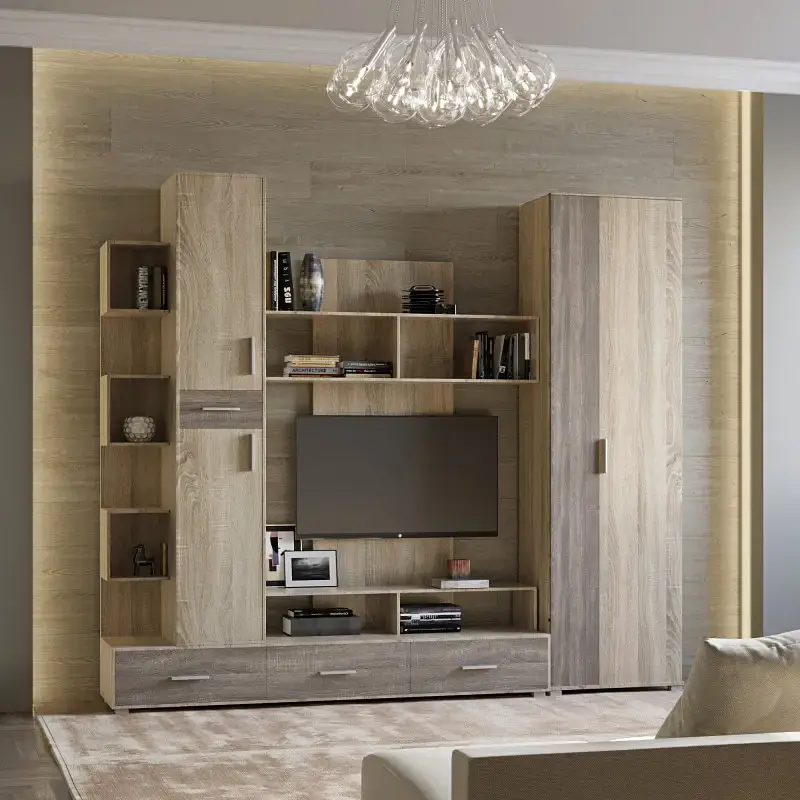 Функціональна стінка для вітальні Бриз є частиною колекції Бриз від виробника Еверест. Практичні та стильні меблі виготовлені з ламінованого ДСП. Оснащена всім необхідним для облаштування відкритої вітальні. Наповнення стінки складається з двох великих тумб, чотирьох містких ящиків та комбінації полиць, які можна заповнити книгами, електронікою та елементами декору. Оригінальність додає широка ніша для ТБ. Додатковою перевагою цієї моделі є містка шафа з внутрішніми полицями.