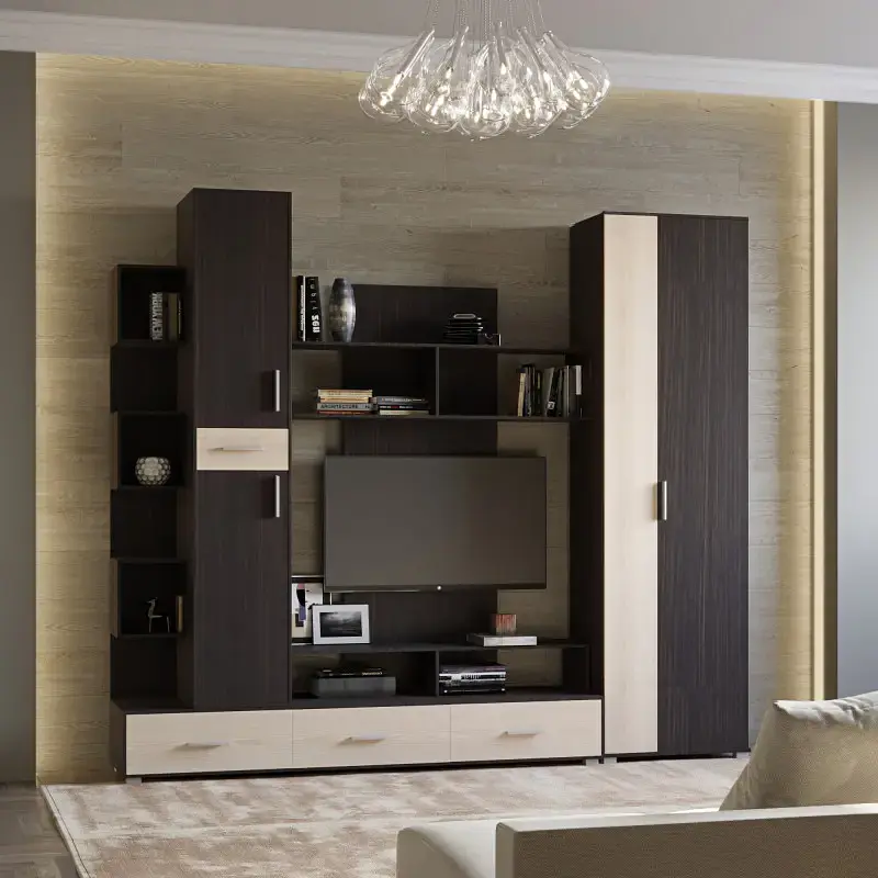 Функціональна стінка для вітальні Бриз є частиною колекції Бриз від виробника Еверест. Практичні та стильні меблі виготовлені з ламінованого ДСП. Оснащена всім необхідним для облаштування відкритої вітальні. Наповнення стінки складається з двох великих тумб, чотирьох містких ящиків та комбінації полиць, які можна заповнити книгами, електронікою та елементами декору. Оригінальність додає широка ніша для ТБ. Додатковою перевагою цієї моделі є містка шафа з внутрішніми полицями.