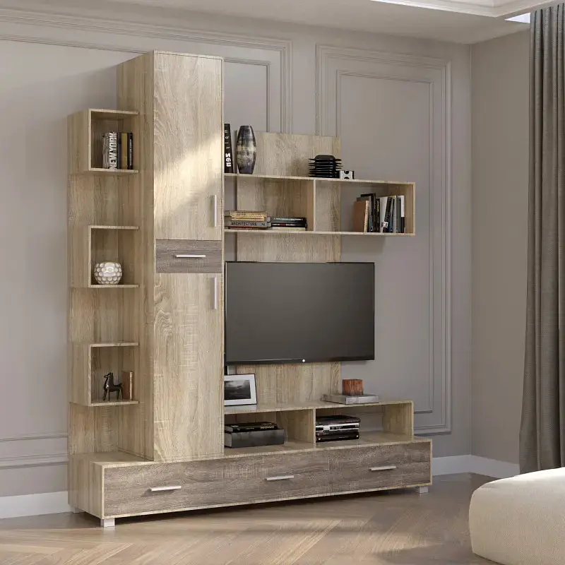 Укомплектована трьома великими ящиками та однією невеликою у верхній частині виробу. ТВ-ніша призначена для встановлення телевізора, а велика кількість полиць дозволяє розмістити додаткову техніку, елементи декору та необхідні аксесуари. Функціональна конструкція також оснащена двома місткими шафками, де можна зберігати документи та інші важливі предмети.