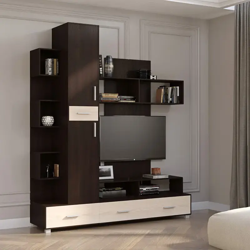 Укомплектована трьома великими ящиками та однією невеликою у верхній частині виробу. ТВ-ніша призначена для встановлення телевізора, а велика кількість полиць дозволяє розмістити додаткову техніку, елементи декору та необхідні аксесуари. Функціональна конструкція також оснащена двома місткими шафками, де можна зберігати документи та інші важливі предмети.