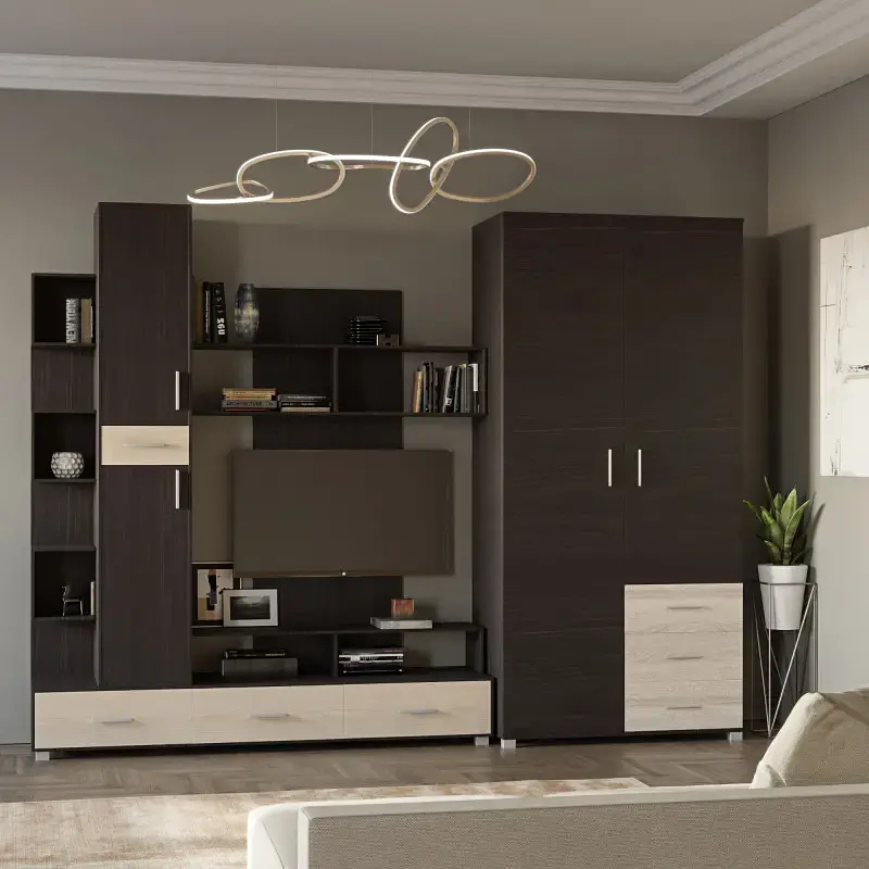 Практична та надійна конструкція складається зі стінки для вітальні та великої розпашної шафи з трьома висувними ящиками. Також стінка укомплектована ТВ-полицею для телевізора. Дана модель - це максимально практичні меблі для облаштування сучасної вітальні.