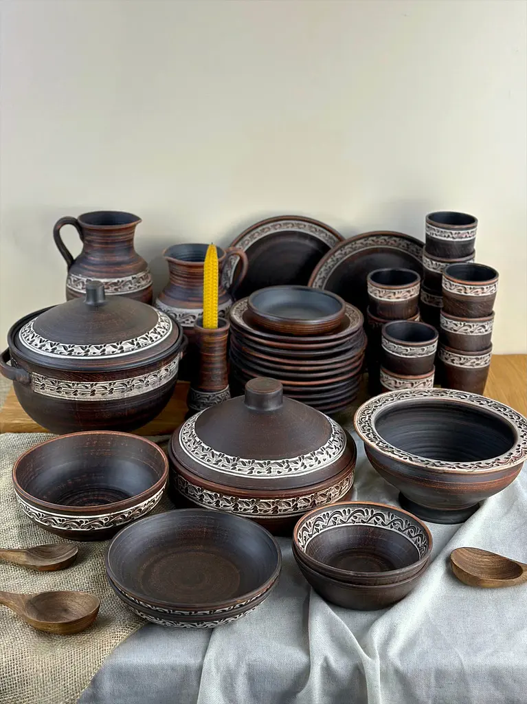 Вишуканий набір керамічного посуду з ангобним покриттям, що поєднує традиційний стиль і сучасну практичність. Натуральна глина зберігає тепло страв, а техніка ангобного нанесення надає природну текстуру і глибокий колір. Ідеальний варіант для великої родини або урочистого застілля.