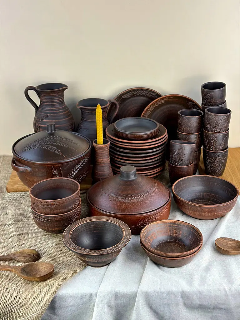Вишуканий набір керамічного посуду з рельєфним візерунком Колосок - символом достатку і благополуччя. Цей комплект поєднує естетику традиційної української кераміки і практичність для повсякденного використання. Ідеальний для сервірування святкового столу або сімейного обіду.