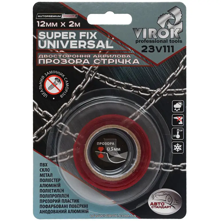 Стрічка двостороння акрилова Virok Super Fix Universal виготовлена зі спіненого акрилу, який володіє високим рівнем еластичності. Забезпечує щільне прилягання до криволінійних, пористих та інших типів поверхонь, що дає можливість широкого спектру використання.