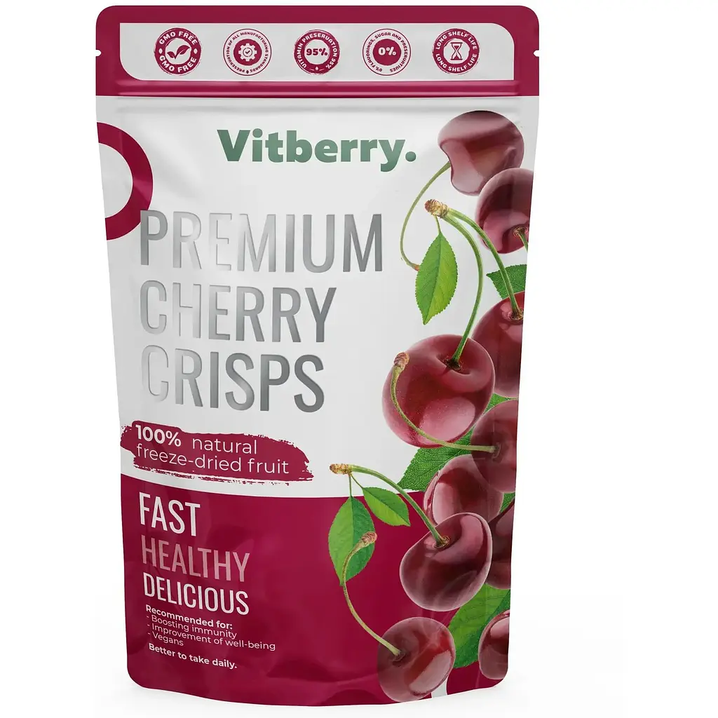 Сублімована черешня Vitberry - це справжня знахідка для любителів солодкого і кислого смаку. Черешня багата на вітаміни C, A, B1, B2, E, PP, мікроелементи (залізо, йод), а також на антоціани, які сприяють здоров’ю шкіри та імунітету, а також містить мелатонін, гормон, що допомагає регулювати цикл сну й неспання, і вони можуть допомогти поліпшити його якість. Черешня сублімована ідеально підходить для приготування десертів, варення та коктейлів. Спробуйте нашу продукцію та насолоджуйтеся смаком цієї натуральної ягоди.