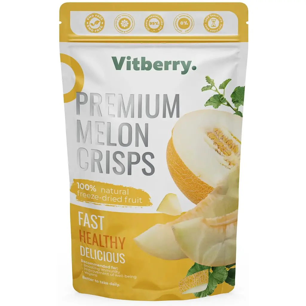 Сублімована диня Vitberry - це свіжий смак літа, доступний цілий рік. Ми зберегли натуральний смак і аромат дині, не додаючи зайвих компонентів. Диня багата на залізо, калій, кальцій, магній, вітаміни групи В, вітаміни С і А, а також на антиоксиданти, які підтримують здоров’я шкіри та імунітету. Цей фрукт ідеально підходить для закусок, салатів, морозива та смузі. Спробуйте сублімовану диню Vitberry та відчуйте літо в будь-яку пору року.