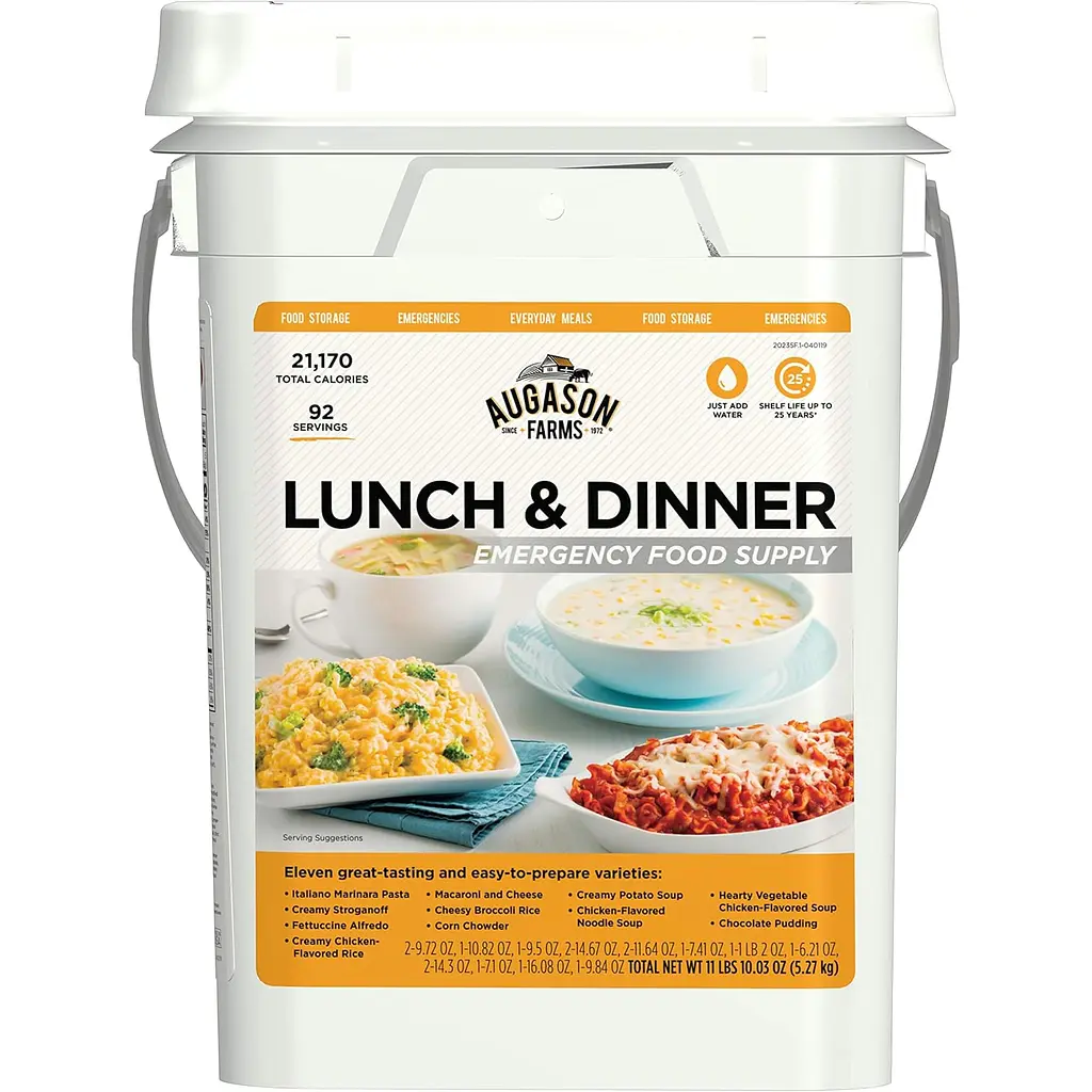 Останній день акціїСублімовані обіди та вечері Augason farms розраховані для повноцінного денного та вечірнього харчування однієї людини на термін близько 20 днів із щоденною нормою на обід з вечерею 1058 калорій. У цьому наборі міститься кілька видів як рідких страв (супи), і різних видів вечері.