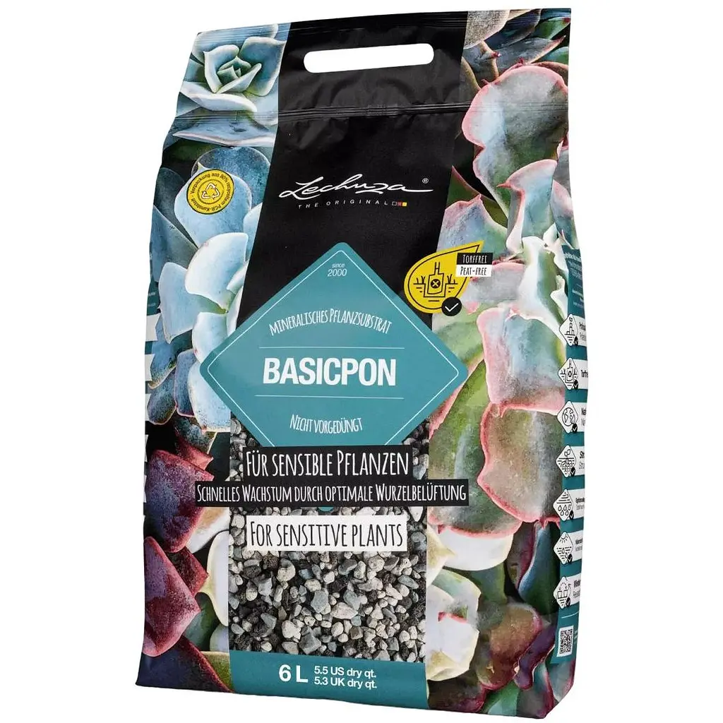 Субстрат Lechuza Basic Pon використовує ті ж перевірені інгредієнти, що й Lechuza Pon, але без будь-яких добрив, тому він ідеально підходить для чутливих рослин. Слід зазначити, що Basic Pon є правильним вибором для вирощування саджанців та чутливих пагонів. Cубстрат забезпечує рослинам оптимальне співвідношення повітря та води, стабільне значення pH, накопичує воду та поживні речовини, виділяючи їх рослинам в міру потреби. Заболочування виключено завдяки відмінній дренажній здатності мінерального субстрату.