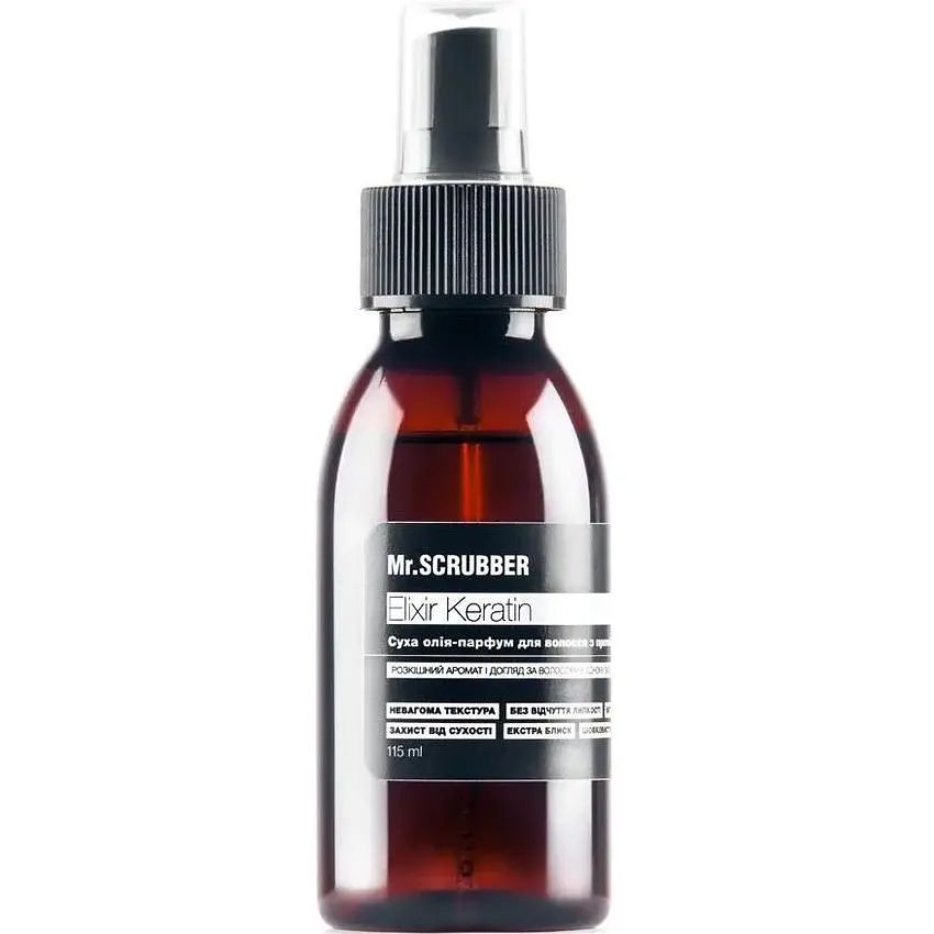 Сухе олія-парфум для волосся Mr.Scrubber Elixir Keratin миттєво розгладжує і надає волоссю дивовижний блиск і шовковистість. Надзвичайно легка текстура засобу не обтяжує волосся, глибоко живить кінчики, зміцнює та відновлює структуру волосся, заповнюючи її зсередини.