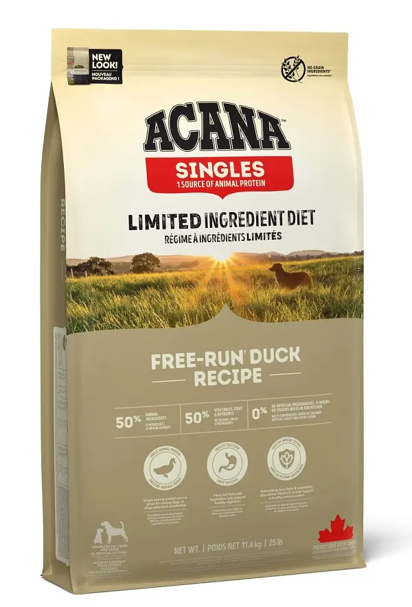 Повноцінний раціон ACANA Free-Run Duck створений на основі м’яса качки, вирощеної на вільному вигулі, що є єдиним джерелом тваринного білка. Завдяки високому вмісту м’ясних інгредієнтів (50%) у співвідношенні WholePrey™ — з м’ясом, органами та хрящами — цей корм підтримує м’язи, імунітет та енергійність вашого собаки на щодень.