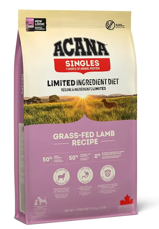 Преміальний монопротеїновий раціон ACANA Grass-Fed Lamb створений для собак з чутливим травленням і харчовими алергіями. До складу входить 50% якісного ягнячого м’яса, включаючи свіже м’ясо, печінку, нирки, хрящі та рубець у співвідношенні WholePrey™ — щоб відтворити природний раціон хижаків.
