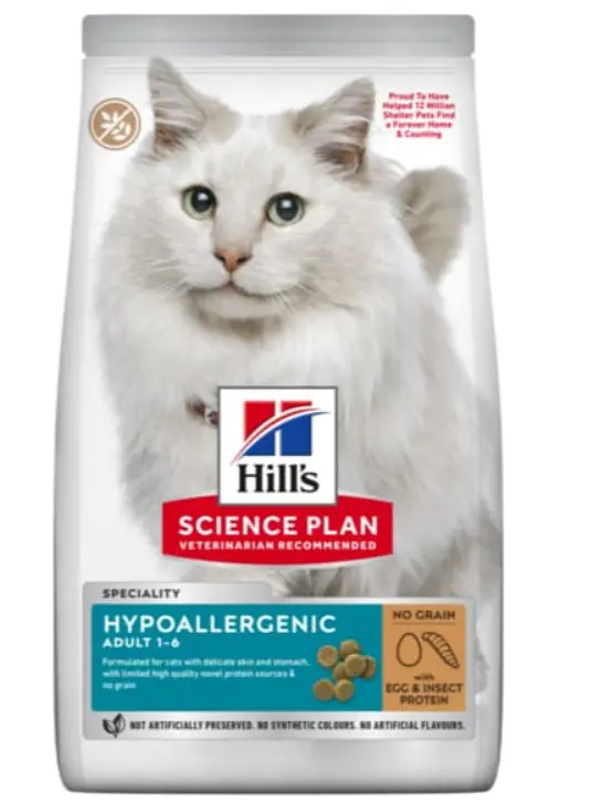 Hill’s Science Plan Adult Hypoallergenic з яєчним білком і протеїном комах – це повнораціонне харчування для дорослих котів віком від 1 до 6 років. Корм виготовлено спеціально для котів із ніжною шкірою та чутливим шлунком. До складу входить інноваційний високоякісний білок в обмеженій кількості. Продукт не містить зернових. Корм Hill’s Science Plan Adult Hypoallergenic — це ніжна страва, до складу якої входить інноваційний високоякісний білок в обмеженій кількості. Виготовлено спеціально для задоволення потреб котів із чутливістю до певних компонентів їжі.