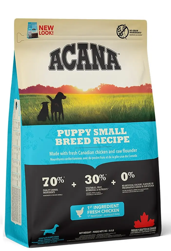 Раціон ACANA Puppy Small Breed спеціально розроблений для задоволення підвищених потреб у харчуванні активних цуценят малих порід. Цей збалансований високопротеїновий корм містить 70% якісних м’ясних інгредієнтів, включаючи свіже м’ясо канадських курчат, печінку, яйця та сиру камбалу. Інші 30% рецептури складають овочі, фрукти, зелень і трави, що доповнюють раціон вітамінами, антиоксидантами та клітковиною.