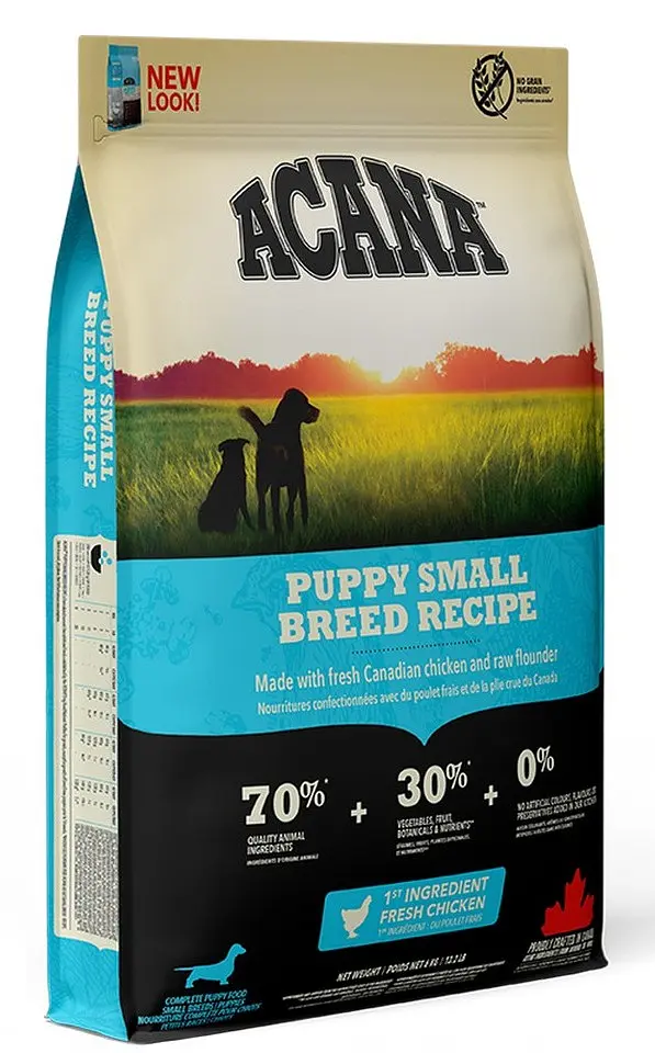 Раціон ACANA Puppy Small Breed спеціально розроблений для задоволення підвищених потреб у харчуванні активних цуценят малих порід. Цей збалансований високопротеїновий корм містить 70% якісних м’ясних інгредієнтів, включаючи свіже м’ясо канадських курчат, печінку, яйця та сиру камбалу. Інші 30% рецептури складають овочі, фрукти, зелень і трави, що доповнюють раціон вітамінами, антиоксидантами та клітковиною.