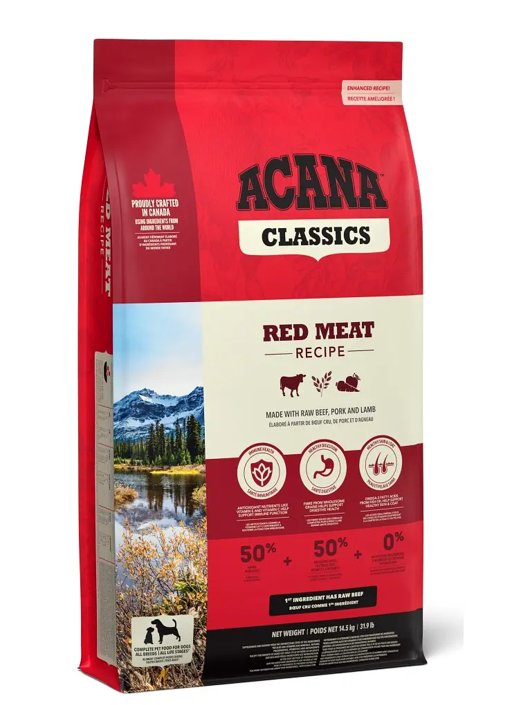 ACANA Red Meat Recipe — це повноцінний раціон для собак, створений на основі простих, натуральних інгредієнтів, який поєднує користь червоного м’яса, поживних злаків, овочів та фруктів. Рецептура розроблена таким чином, щоб задовольнити потреби собак усіх порід і на всіх етапах життя.