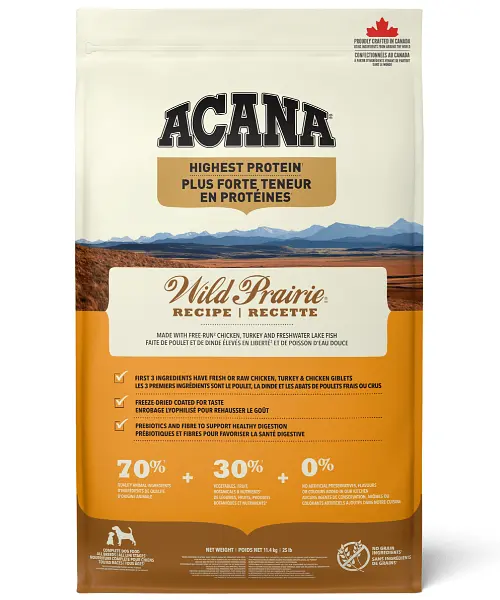 Бажаєте забезпечити свого улюбленця харчуванням, що відповідає його природним потребам? ACANA Wild Prairie Dog Recipe — це високопротеїновий беззерновий корм для собак, створений на основі м’яса вирощених на фермах курчат, індички та дикої риби.