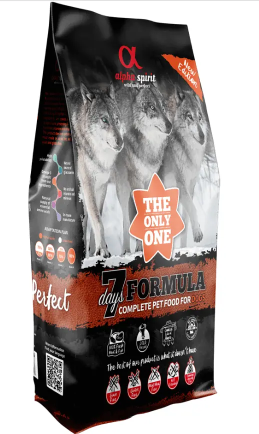 ALPHA SPIRIT The Only One 7 Days Formula – це повнораціонний корм для собак, виготовлений з найкращих натуральних інгредієнтів для підтримки здоров'я та сил ваших улюбленців. Корм виготовляється без екструзії, без додавання зернових, м’ясного борошна та глютену. Раціон The Only One 7 Days створений лише зі свіжої риби та м’яса. Для приготування 1 кг корму використовується 2,34 кг свіжого м’яса та 0,26 кг свіжої риби при бережному процесі приготування за низьких температур, забезпечуючи збереження всіх поживних речовин, вітамінів та мінералів. Іншою великою перевагою цього раціону є те, що він не містить доданих жирів, зернових та глютену.