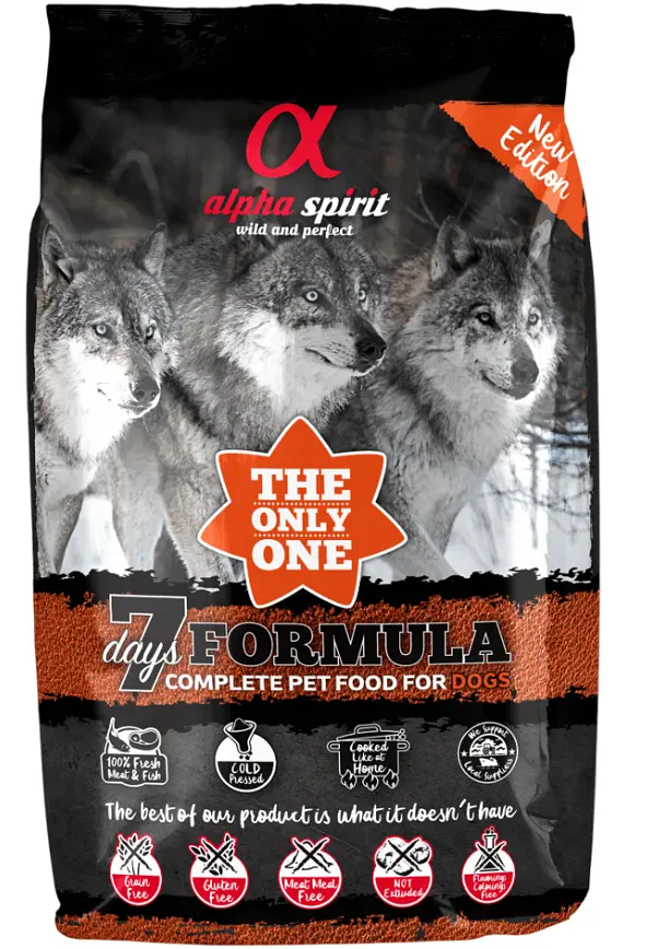 ALPHA SPIRIT The Only One 7 Days Formula – це повнораціонний корм для собак, виготовлений з найкращих натуральних інгредієнтів для підтримки здоров'я та сил ваших улюбленців. Корм виготовляється без екструзії, без додавання зернових, м’ясного борошна та глютену. Раціон The Only One 7 Days створений лише зі свіжої риби та м’яса. Для приготування 1 кг корму використовується 2,34 кг свіжого м’яса та 0,26 кг свіжої риби при бережному процесі приготування за низьких температур, забезпечуючи збереження всіх поживних речовин, вітамінів та мінералів. Іншою великою перевагою цього раціону є те, що він не містить доданих жирів, зернових та глютену.