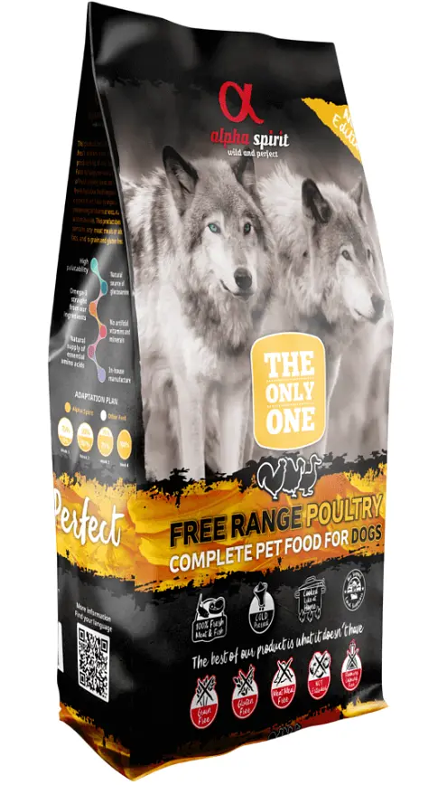 ALPHA SPIRIT The Only One Poultry – це повнораціонний корм для собак всіх порід. Корм виготовлений з найкращих натуральних інгредієнтів для підтримки здоров'я та сил собак. Корм виготовляється без екструзії, додавання зернових, м’ясного борошна та глютену.