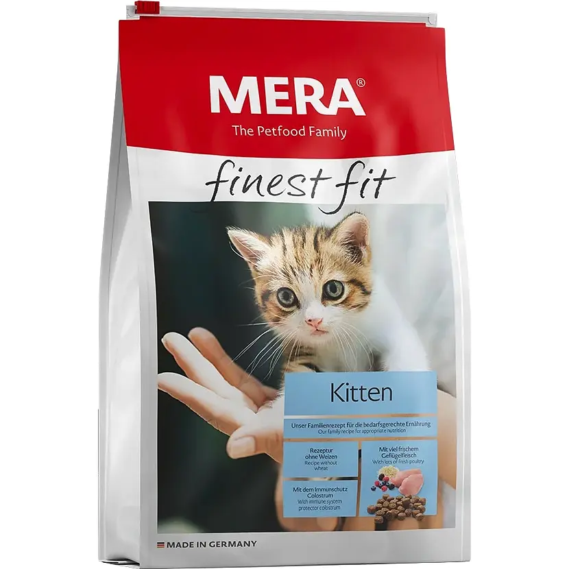 Mera Finest Fit Kitten розроблений з урахуванням особливих потреб зростаючих кошенят. Корм має легкозасвоювану рецептуру на основі птиці, рису та ягід, багатий нутрієнтами, необхідними для здорового росту й розвитку улюбленця. Має високий вміст білка з додаванням молозива, необхідного для захисту організму кошеняти від патогенних організмів.