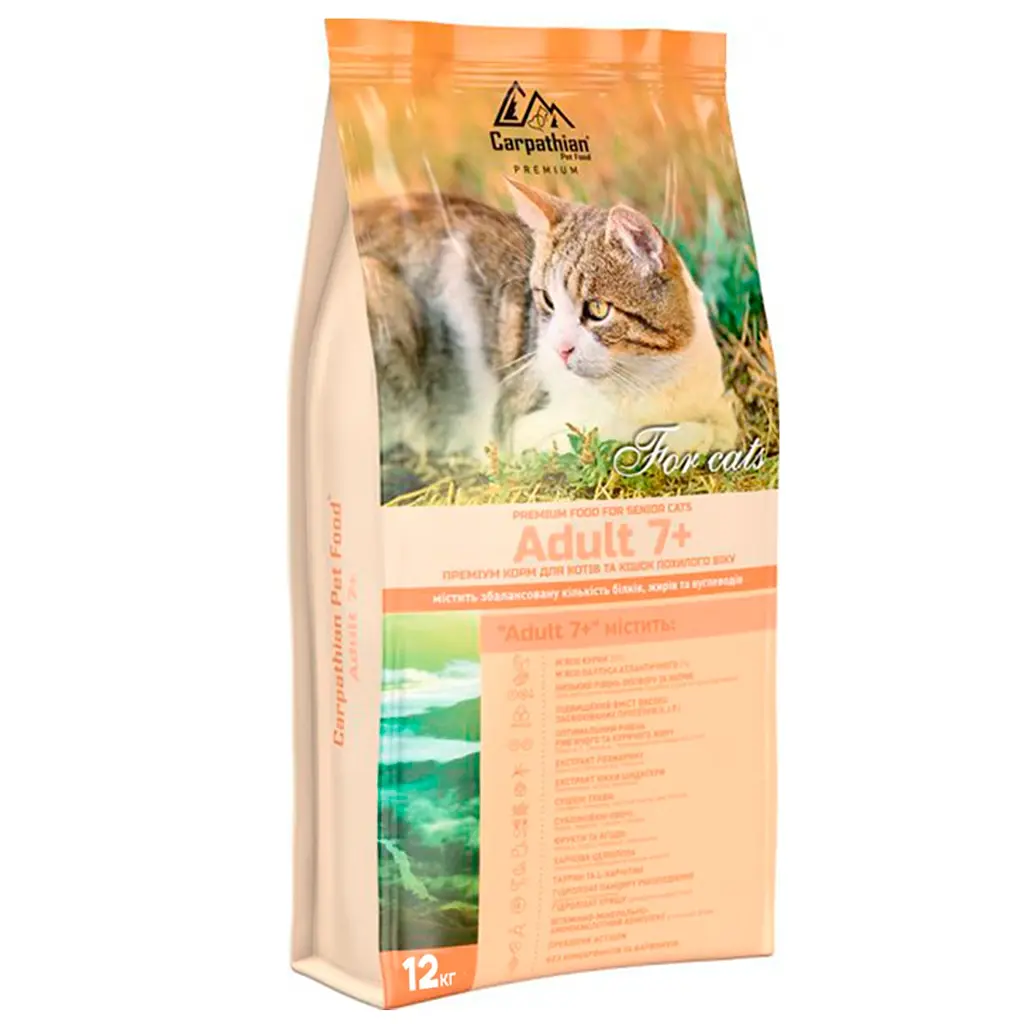 У порівнянні з кормами для котів молодшого віку, корм Carpathian Pet Food Adult 7+ розроблений зі зменшеною кількістю білків та жирів, що допомагає попередити ожиріння та полегшує роботу нирок. Вміст у кормі L-карнітину забезпечує процес розщеплення жирів, сприяє зниженню надлишкової ваги, посилює білковий обмін, що підвищує тонус м’язів і підтримує роботу серця.