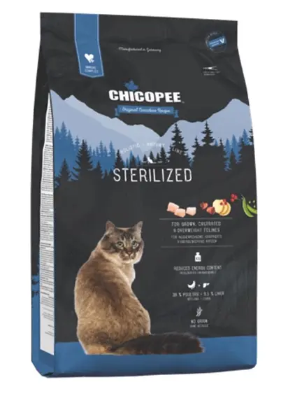 Chicopee HNL Sterilized — повноцінне харчування для дорослих стерилізованих котів, що сприяє покращенню травлення, здоров'ю та довголіттю тварини. Цей корм пасує для хатніх котів і стерилізованих.